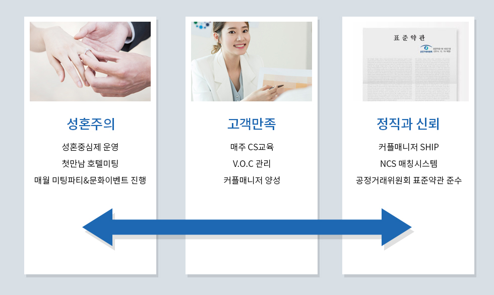 고객 입장에서 앞으로의 인생에 있어 도움이 되었다는 말을 듣는 게 경영이념이라는 말씀을 하셨어요. 솔직히 처음에는 '이게 무슨 상관이지?' 싶은 생각이 들었는데요. 그런데! 이후 말씀해주신 매칭 방식에서 그런 경영이념이 확실히 묻어 나오는구나 느꼈답니다. 여기는 매니저 3명에서 회원 한 명을 담당하며 직접 회의를 통해서 사람을 소개 시켜주더라고요. 보통 저는 등급표가 당현히 있을 줄 알았거든요.